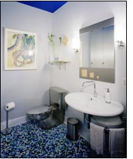 A dramatic dark royal blue ceiling anchors the space as the soft gray walls allow for a smooth transition to the floor. The use of the brushed stainless steel toilet adds to the uniqueness of this elegant space. The white asymmetrical sink, counter-balanced by the brushed aluminum storage cart with towel bar, adds a sense of daring style! The brushed stainless steel mirror with maple square accents continues to emphasize the asymmetry. The wall of embossed, brushed aluminum with the brushed aluminum border at the top and raised square accents reflects light and enlarges the space. The subject of rope in the painting ties the wood, metal and color together. The clean, simple lines, geometric forms, cool metals and colors work together to create a sculptured, finished look and a cool, urban feel!